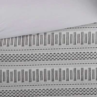 Give your bedroom a comfortable farmhouse look with Rhea Cotton Jacquard Duvet Cover Mini Set. The ivory cotton duvet cover features horizontal stripes, in charcoal hues, with eyelash-looking woven details that add a charming accent to the top of the bed. Matching shams mimic the design seen on top of the bed completing the cotton jacquard bedding set. Made from 100% cotton, this jacquard duvet cover set is machine washable for easy care and provides a causal allure for your bedroom décor. A button closure allow you to place a comforter insert within the duvet cover and four inside ties on the corners help prevent it from shifting (Insert is NOT included). This bedding set is also OEKO-TEX certified, meaning it does not contain any harmful substances or chemicals, ensuring quality comfort and wellness. Items in the set may come in a rolled or compressed packaging, which will need to be fluffed up or steam ironed before use to remove wrinkles.