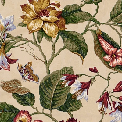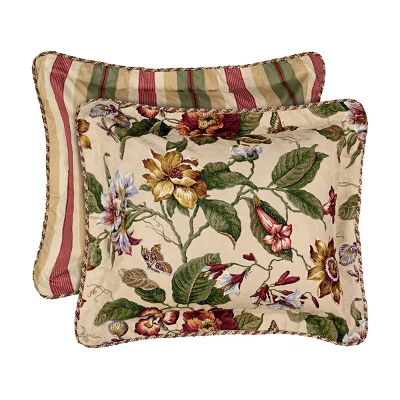 Transform any bedroom into an exotic garden oasis with the Laurel Springs bedding collection. The traditional leafy vine, floral and coordinating stripe design come to life in rich jewel tones of crimson red, green, blue, and gold with contrasting cream accents on a natural ground. Fluttering butterflies and busy dragonflies add flair and visual interest to the beautiful floral design. The bold patterns, bright accents and decorative motifs, offer an elegant and majestic update to any bedroom decor. Each reversible comforter is crafted of woven, 100% cotton jacquard, creating just the right blend for visual interest and surface texture. Woven jacquard offers an all-over leaf design to compliment the bold floral print. Stripe on the comforter reverse and tri-colored, decorative braided ribbon adds a luxurious finish to the comforter and shams. The 5-box pleat bed skirt construction offers sophistication and visual interest for a more tailored, designer look. Queen comforter set features a 92” x 96” reversible comforter, two 21” x 26” standard shams, and a 60” x 80” tailored bedskirt with 15” drop. King comforter set includes a 110” x 96” reversible comforter, two 21” x 36” king shams, and a 78” x 80” tailored bedskirt with 15” drop. The comforter, shams and bed skirt are machine washable for easy-care. Wash in cold water on the gentle cycle and tumble dry on low for optimal care and long lasting beauty.