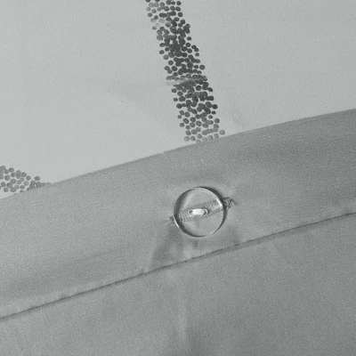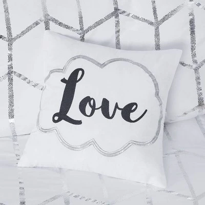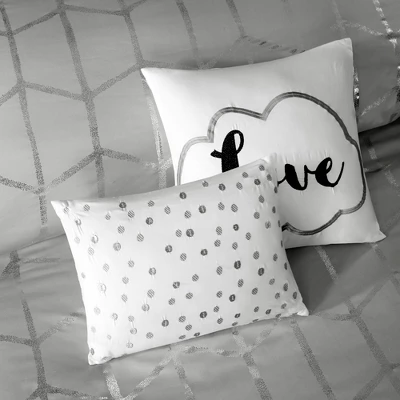 Freshen up your bedroom with the enchanting style of the Arielle Metallic Printed Duvet Cover Set with Decorative Pillows. The stunning duvet cover flaunts a geometric, metallic print against a vibrant ground for a fun and eye-catching look! Matching sham(s) echo the design seen on top of bed and pulls the entire ensemble together. Two embroidered decorative pillows with typography and metallic details complete this fabulous duvet cover set. Button closures allow you to place a comforter insert within the duvet cover and internal corner ties prevent it from shifting.