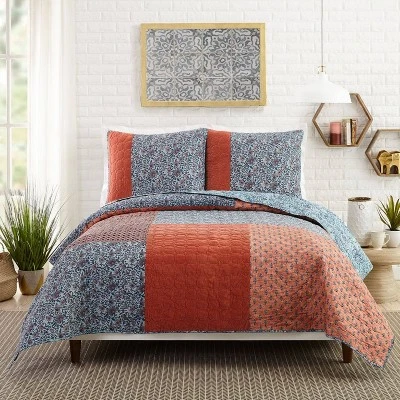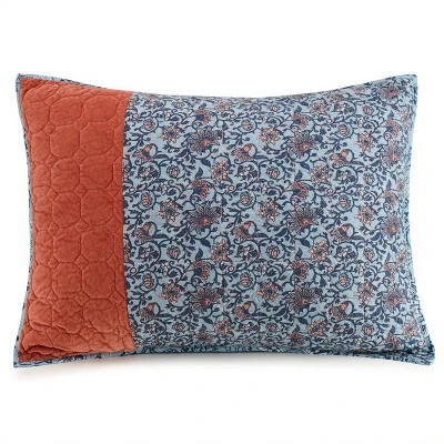 A new and exotic pieced pillow sham with the look of hand-crafted Indian prints from Jessica Simpson. The quilt features big blocks of small textured floral prints in desert spice and blue that are pieced together in a bold pattern. The pillow shams are a rich floral print with intertwined vines in shades of indigo blue with beautiful pieces of velvet in desert rose adding a surprising element that completes the luxurious look and feel of the shams. 100% cotton.