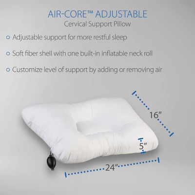 Whether you prefer gentle or very firm neck support while you sleep, the Air-Core™ Adjustable Pillow can easily accommodate your support preference. This pillow is commonly used to help treat a variety of conditions affecting the neck and shoulders. This pillow is designed with the same features of our popular Tri-Core® Cervical Support Pillow with the addition to the built-in inflatable neck roll controlled by hand pump for convenient adjustability.