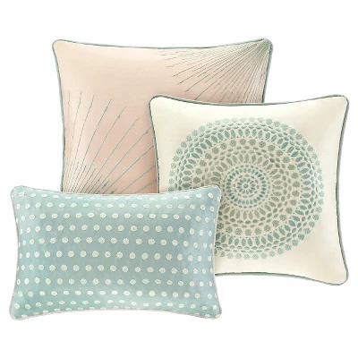 Create a calm and peaceful atmosphere in your room with the Madison Park Grant 7 piece comforter set. This comforter has a light sage color on both sides and is made of a polyester jacquard fabric with a stunning geometric pattern in seafoam blues and greens. A flange of 1/2″ in a slight dark taupe adds contrast and harmony to the blue and green hues. Three decorative pillows with embroidery and pleating details complete this tranquil look.