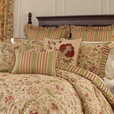 Imperial Dress Antique is a classic Waverly pattern, inspired by Jacobean floral designs and styled with a modern twist. The vintage Antique color story is exemplified here in muted hues of green, red and gold on a warm neutral ground. Comforter and coordinating pillow shams feature a luxurious 100% cotton textured floral jacquard fabric. Comforter reverses to 100% woven cotton coordinating stripe pattern also found on the coordinating pillow shams, decorative pillows and tailored bed skirt. Comforter and shams feature a 1/4″ tricolored twist cord finish for added style. Bedding accessories include accent pillows and shams Decorative pillows offer opulent embellishments including multi-color twisted braid trim, fringe and ruffled flange. Tailored 15-box pleat bed skirt offers a hotel-style finishing touch and has a generous 16″ drop. This collection allows you to easily change your bedroom look with reversible floral and stripe comforter and shames. Layer on decorative pillows for comforter and style. Comforter set includes 1 comforter, 1 bed skirt, and 2 shams. Queen set features a 92″x96″ reversible comforter, two 21″x26″ standard shams and one 60″x80″ bed skirt. King comforter set features a 110″x96″ reversible comforter, two 21″x36″ king shams and one 78″x80″ bed skirt. Machine wash. Imported
