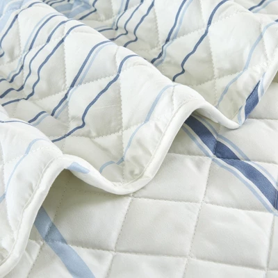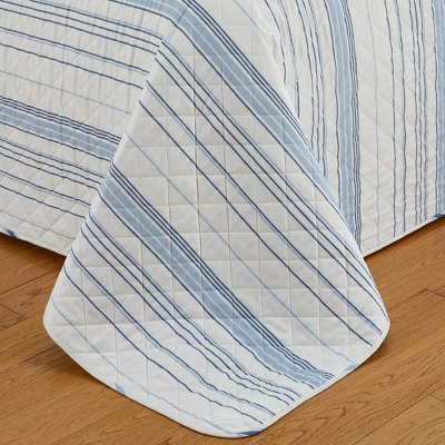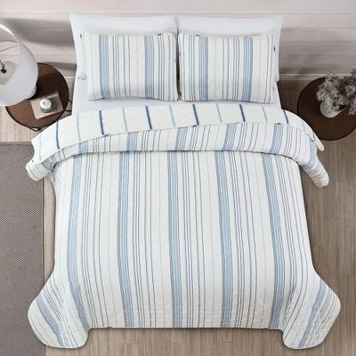 Add casual comfort with a modern flair to your home with this beautiful Sofia Collection Reversible Striped Quilt Set by Market & Place. Crafted with a soft and breathable microfiber exterior and cotton/polyester fill, this quilt set keeps you cozy and comfortable all year long. It’s classic light blue and off-white striped design with a simple striped pattern on the reverse side is the perfect accent to the top of your bed. This quilt set is machine washable for easy care and long lasting use. Each quilt set comes with one quilt and two shams (one sham for Twin size). Choose from three sizes: Twin: 1 Quilt (90″ x 66″), 1 Standard Sham (20″ x 26″), Queen: 1 Quilt (90″ x 90″), 2 Standard Shams (20″ x 26″), King: 1 Quilt (90″ x 108″), 2 King Shams (20″ x 36″)