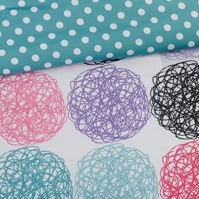 Add color to your bedroom with the Brittany Reversible Comforter Set. Doodled circles create this look with pops of pink, teal, purple and black while a teal polka dot reverse plays up the back. One fun decorative pillow uses stripes of twill tape to showcase all the major colors from the top of bed.