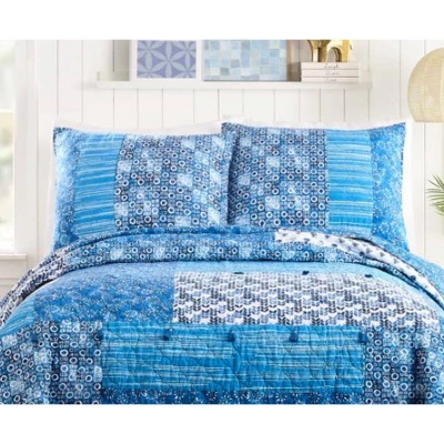 The Jessica Simpson Azra pillow shams are made of pieced cotton fabrics in coordinating patterns all printed with block print inspired motifs in shades of indigo blue for a perfectly zen bedroom look. Made of 100% cotton with cotton fill. The shams are sold individually and the matching quilt is sold separately.