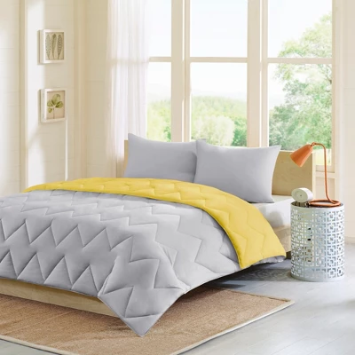 The Penny Reversible Comforter Mini Set is a fun way to add color to your bedroom. The ultra-soft microfiber comforter is exceptionally soft and displays a light grey color with a bright yellow reverse, for a striking look. Chevron quilting adds dimension and charm to the colorful comforter, while matching shams feature a hidden zipper closure for clean and finished edges. Fully reversible and machine washable, this vivid comforter set is easy to care for and makes changing the look of your bedroom a breeze with one easy flip. This comforter set is also OEKO-TEX certified, meaning it does not contain any harmful substances or chemicals to ensure quality comfort and wellness. Set includes: 1 Comforter and 2 Shams (or 1 Sham for Twin sizes).