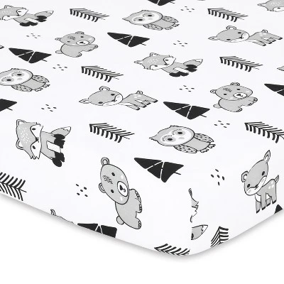 The Wonderful Woodland playard sheet set from The Peanutshell includes 3 unique forest themed allover prints in shades of gray, black and white. A cute character tossed with bears owls, trees, foxes, and deer; tossed stars; and a buffalo check pattern make up this well-curated trio. The all-around elastic design ensures a safe and snug fit that’s compatible with most standard playard mattresses. The fade-resistant material is quick-drying and machine washable, providing excellent quality and easy care at a great value.